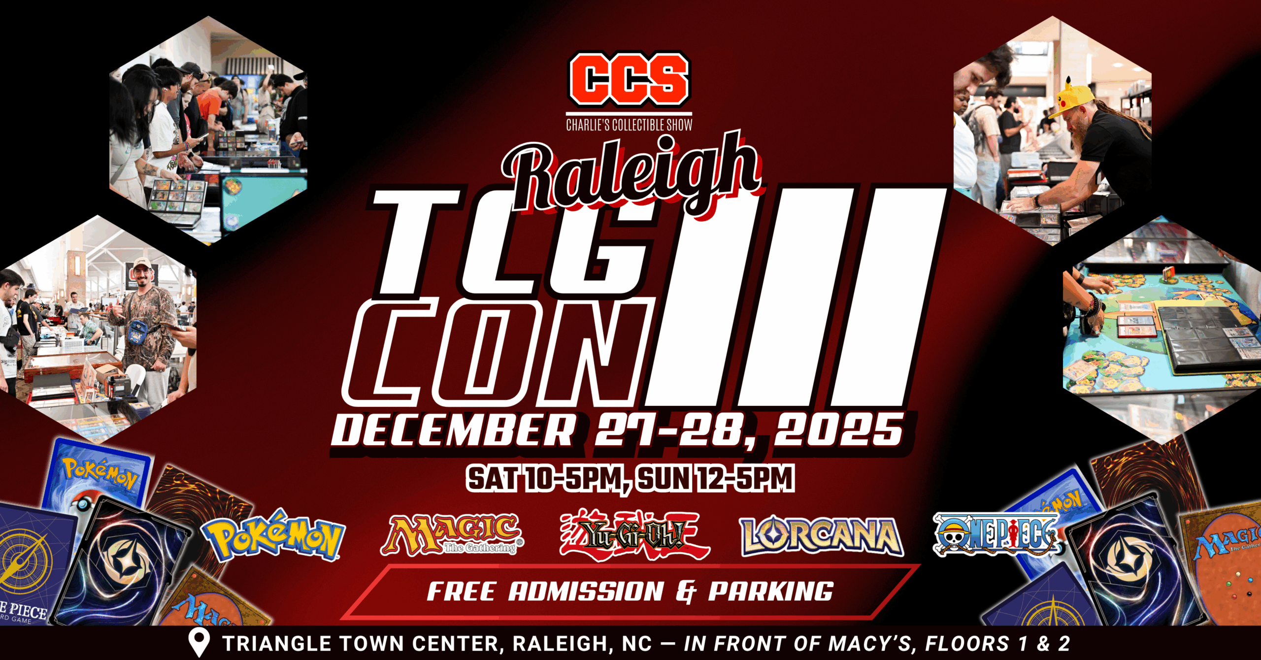 Charlie's Collectible Show 6009 Memorial Drive, Unit 14, Stone Mountain, GA🚀 Raleigh TCG Con II — Fueled by YOUR ENERGY 🚀 After the ROAR you gave us at Raleigh TCG Con I, we had no choice but to LEVEL UP!! 📈‼️ Two full days of non-stop card action right in the heart of Raleigh — Pokémon. Yu-Gi-Oh!. Magic. Lorcana. One Piece. And YOU. 💥 The stage […]